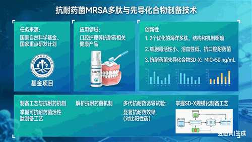任务来源:国家自然科学基金、国家重点研发计划 应用领域:口腔护理等抗耐药相关健康产品 创新性: (1)2 个优化的海洋多肽,结构和机制明确; (2)细胞毒活性小、溶血性低、抗口腔耐药菌; (3)抗耐药菌先导化合物 SD-X:MIC=50 ng/mL。 掌握可抗耐药菌活性肽的制备工艺,解析了抗耐药菌机制,经过多代抗耐药诱导试验,结果表明具有显著的抗耐药效果(对比阳性药)。掌握了抗耐药先导化合物 SD-X 规模化制备工艺。以上样品将应用到口腔相关抗耐药菌MRSA 的防治以及相关的健康用品中。
