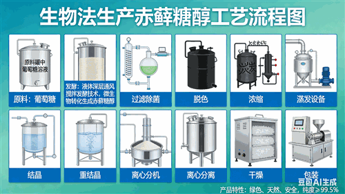 赤藓糖醇是一种新型糖醇类食品甜味剂,天然存在于海藻、蘑菇、甜瓜和发酵食物中,早已作为人类膳食的组分。赤藓糖醇具有结晶性好,吸湿性低,低热量、高稳定性、甜味协调、无吸湿性、冰点低、无龋齿性、不会引起肠胃不适等特点,赤藓糖醇不参与糖代谢,适合糖尿病人食用,可作为糖尿病人的替代性甜味剂;另外赤藓糖醇对热和酸十分稳定,在一般食品加工条件下,几乎不会出现褐变或分解现象。赤藓糖醇作为一种新型的功能食品甜味剂,在食品加工行业具有广泛应用,特别是无糖、零热值等高端健康食品加工领域。赤藓糖醇与市场上已经受到广泛认可的木糖醇具有相同的功能和应用领域,但前者较后者拥有更为广阔的市场前景。GB2760 规定赤藓糖醇可作为食品添加剂在食品中应用,按生产需要添加。赤藓糖醇具有大量食用不会引起木糖醇常见的肠胃不适等优势,特别是无糖食品、特医食品、糖 尿病人等功能食品领域应用十分广泛。赤藓糖醇是葡萄糖(或淀粉糖)为原料,采用液体深层通风搅拌发酵技术,经微生物转化生成赤藓糖醇,发酵液经过滤除菌、脱色、浓缩、结晶、重结晶、离心分离、干燥、包装获得成品,产品绿色、天然、安全,与较木糖醇生产(玉米芯酸解)更安全可靠。随着人们