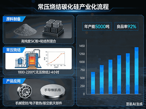 利用磨料行业的废料为原材料,经过专有技术加工成耐高温、耐磨、高导热、耐腐蚀的工业精密陶瓷器件。本技术已经能够完成直径650毫米厚度5毫米的圆盘的制作